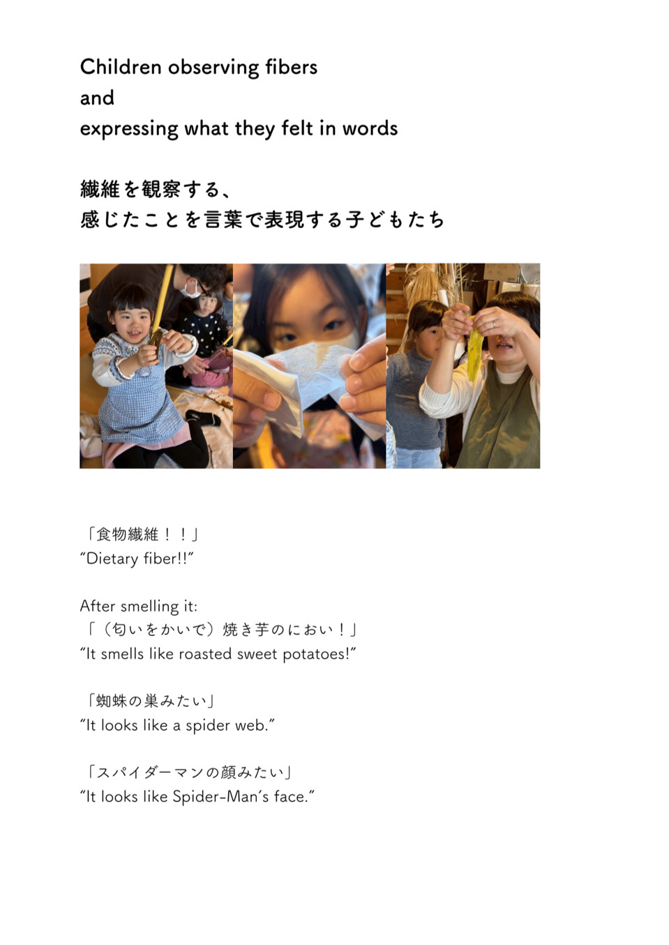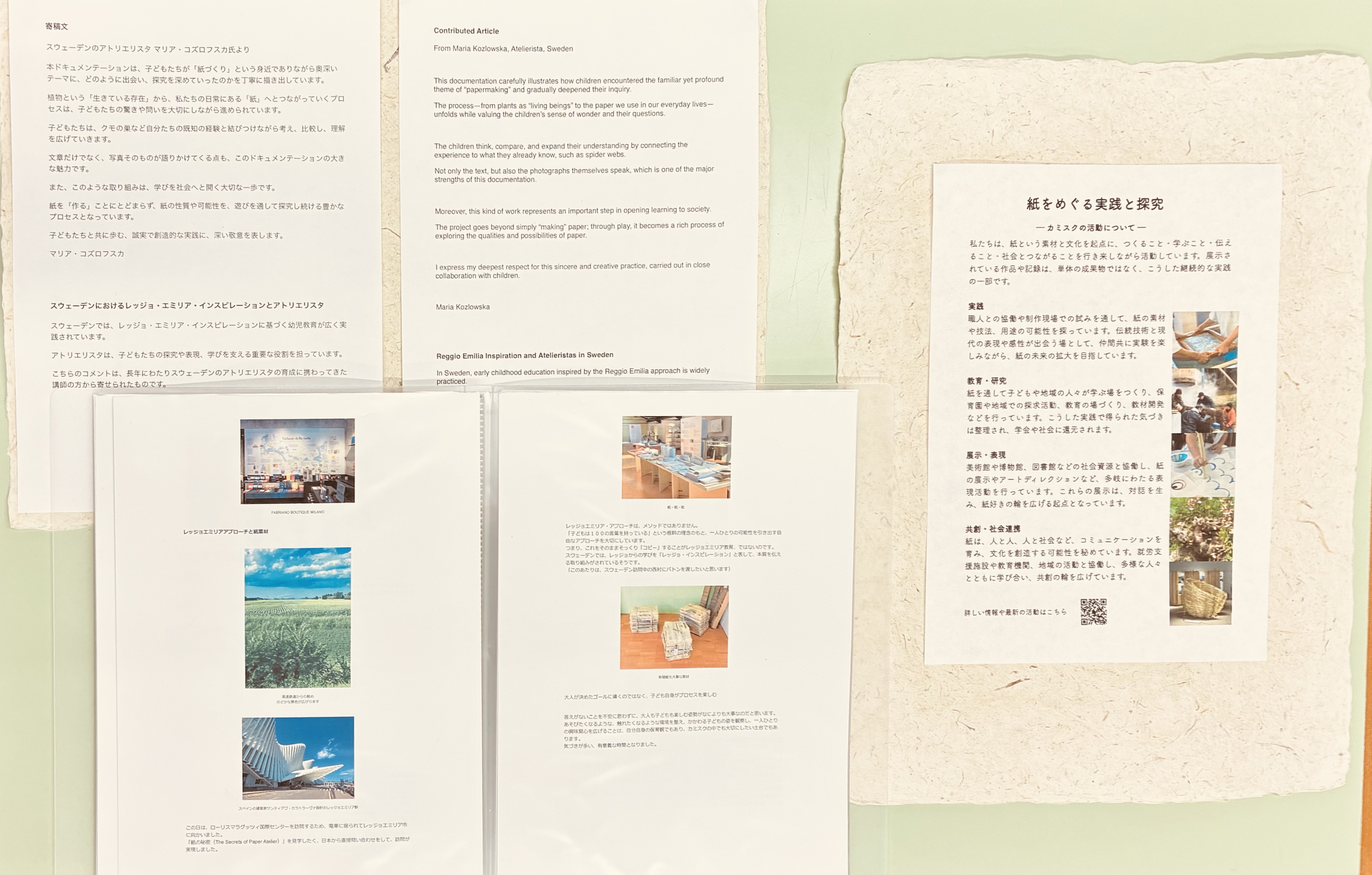 「本ドキュメンテーションは、子どもたちが「紙づくり」という身近でありながら奥深いテーマに、どのように出会い、探究を深めていったのかを丁寧に描き出しています。植物という「生きている存在」から、私たちの日常にある「紙」へとつながっていくプロセスは、子どもたちの驚きや問いを大切にしながら進められています。子どもたちは、クモの巣など自分たちの既知の経験と結びつけながら考え、比較し、理解を広げていきます。文章だけでなく、写真そのものが語りかけてくる点も、このドキュメンテーションの大きな魅力です。